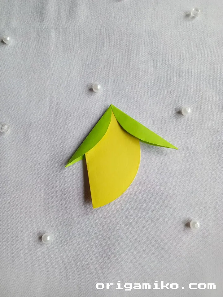 Cut or fold two tiny leaf shapes from green paper. Glue or attach them at the top of your mango. Voilà—Origami mango is made!